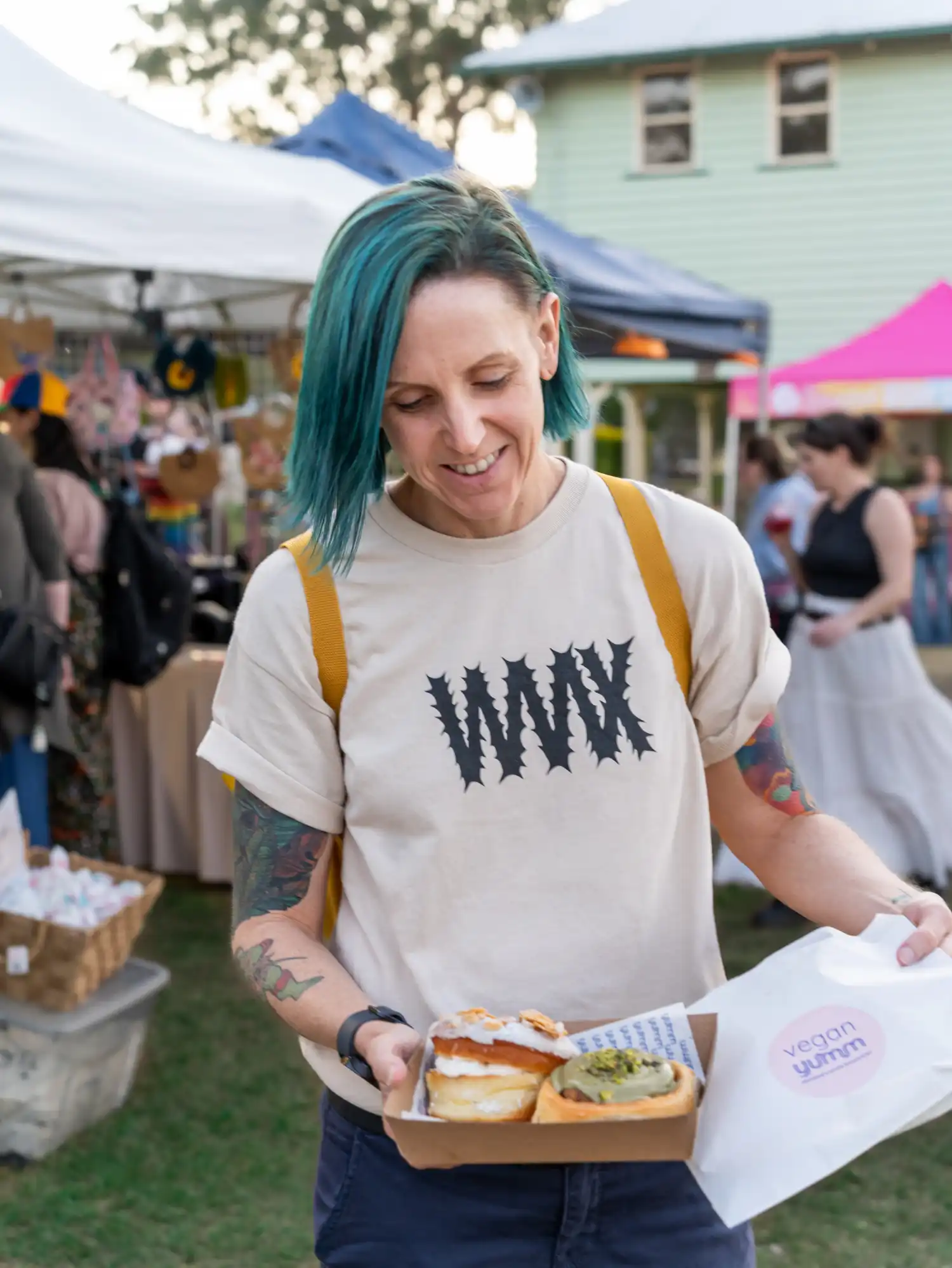 To capture the community vibe of the QLD Vegan Markets, I took wide shots showing the event's scale. I also focused on food spreads and visitors holding dishes to help potential attendees see exactly what the experience is like.